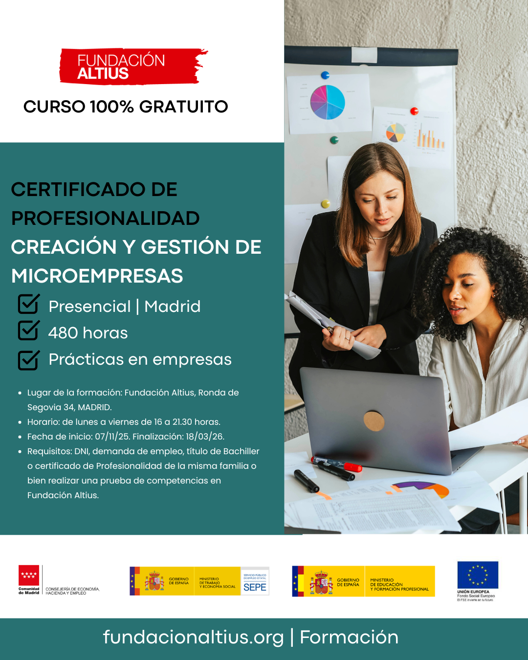 Requisitos: DNI, demanda de empleo, título de Bachiller o certificado de Profesionalidad de la misma familia o bien realizar una prueba de competencias en Fundación Altius.